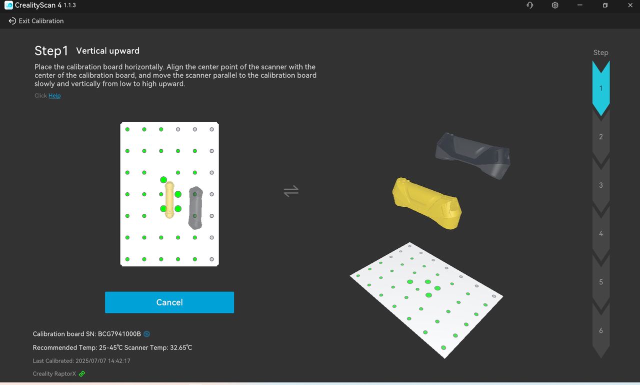 After the current pose acquisition is completed, it will automatically enter the next pose acquisition. Please follow the instructions to move the scanner repeatedly to complete the acquisition of all positions in the entire process. After the acquisition is completed, it will automatically enter the calibration process. Please wait patiently for the calibration results. After the calibration is successful, start scanning to experience high-quality scanning.