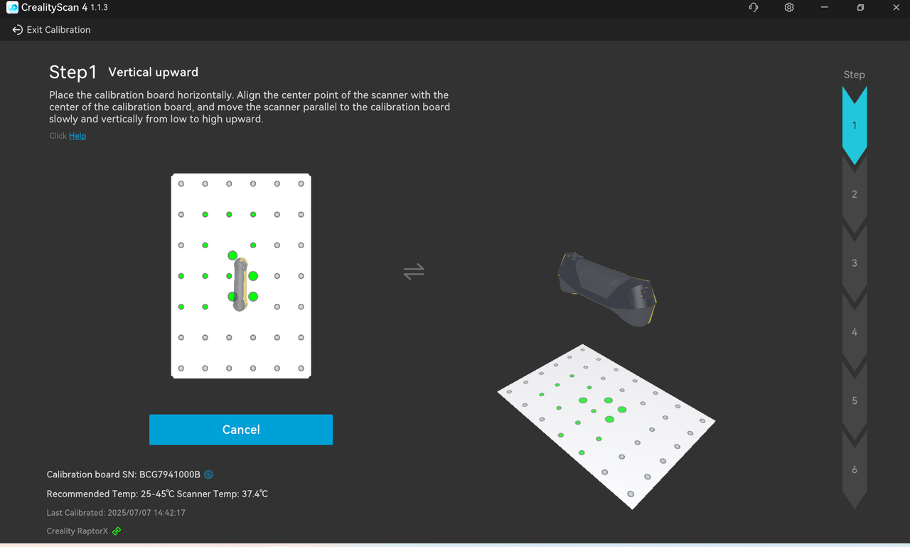 After entering the acquisition process, be sure to aim the scanner at the front of the calibration board and move the scanner according to the guidance.