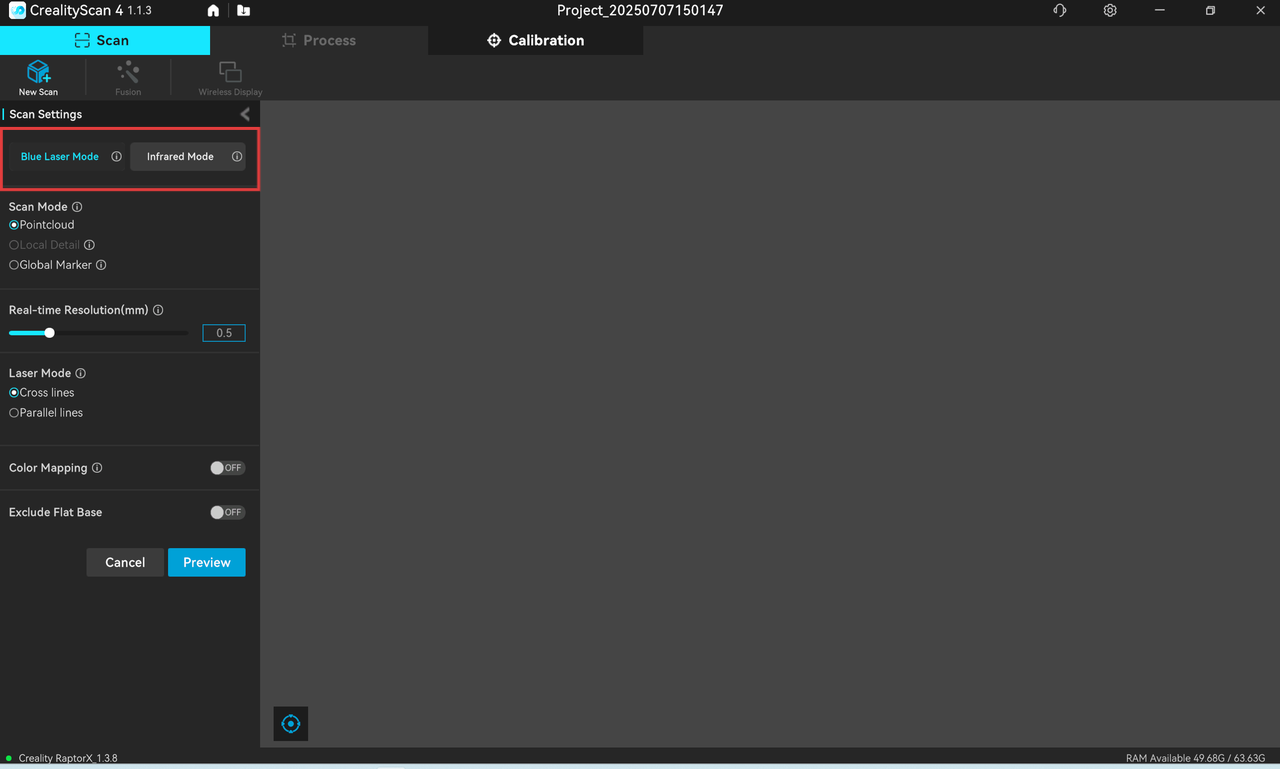 Set the scan configuration and click "Preview" to preview the image and point cloud. You can also adjust the exposure and laser brightness (if you're using blue laser mode). Click "Start" to officially start real-time scanning (see the interface below). You can still adjust the exposure and laser brightness during scanning.