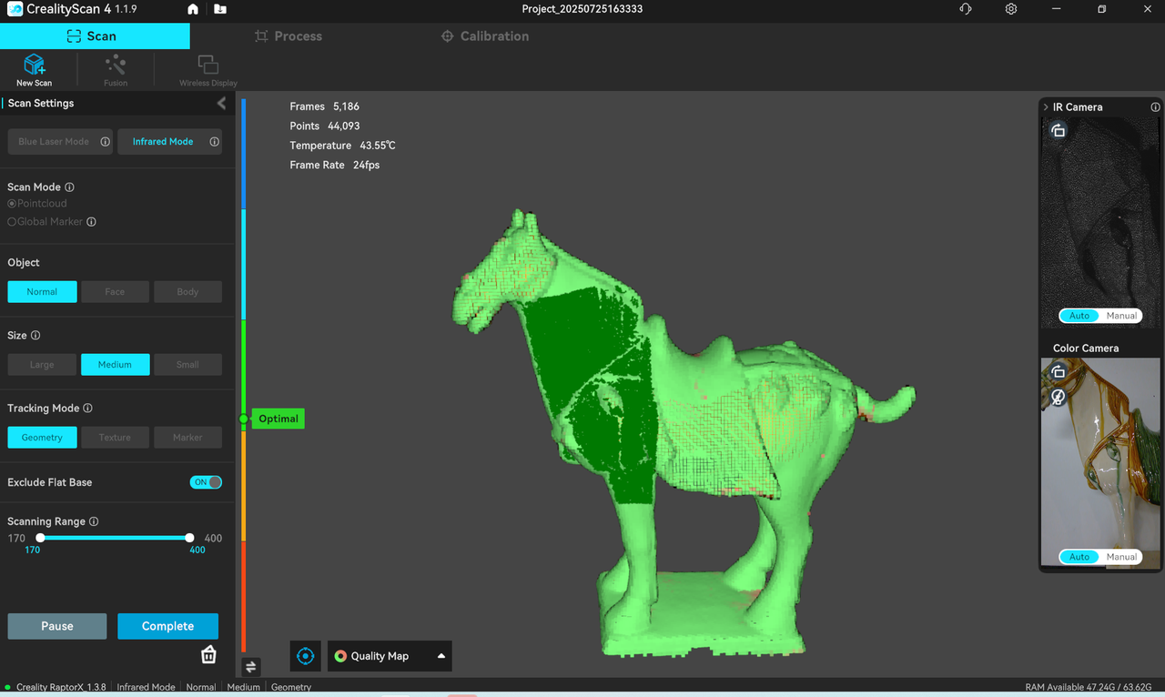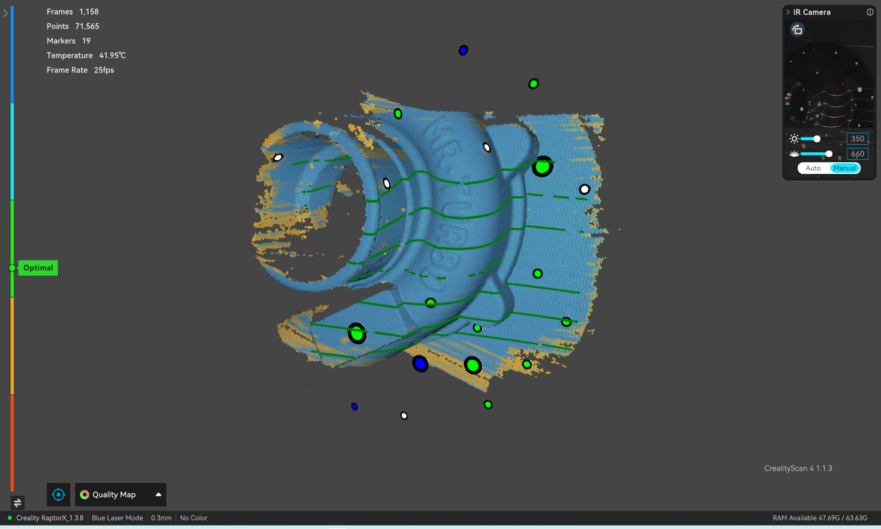 Turn on the "Quality Map" mode, continue scanning according to the interface prompts until all point clouds of the scanned object turn green, indicating that all model data has been acquired and the model quality is high.