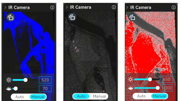 Switch to "Manual" mode to manually adjust the IR exposure for optimal point cloud quality. IR exposure defaults to automatic (for large objects, human figures, or faces). If automatic exposure isn't satisfactory, switch to manual exposure and adjust the image to normal exposure (no blue or red) for better results.
