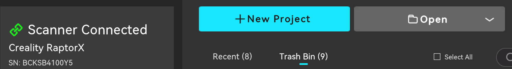 ③ Click "New Project" to start a new scan. Click "Open" and select "Open Project or Model" to import multi-projects (.obp format) or view models (.stl, .obj, .ply format) from a local folder. Click "Import from Smart Phone" to import projects from the mobile APP through the LAN, and be sure to keep the mobile phone and computer in the same LAN.