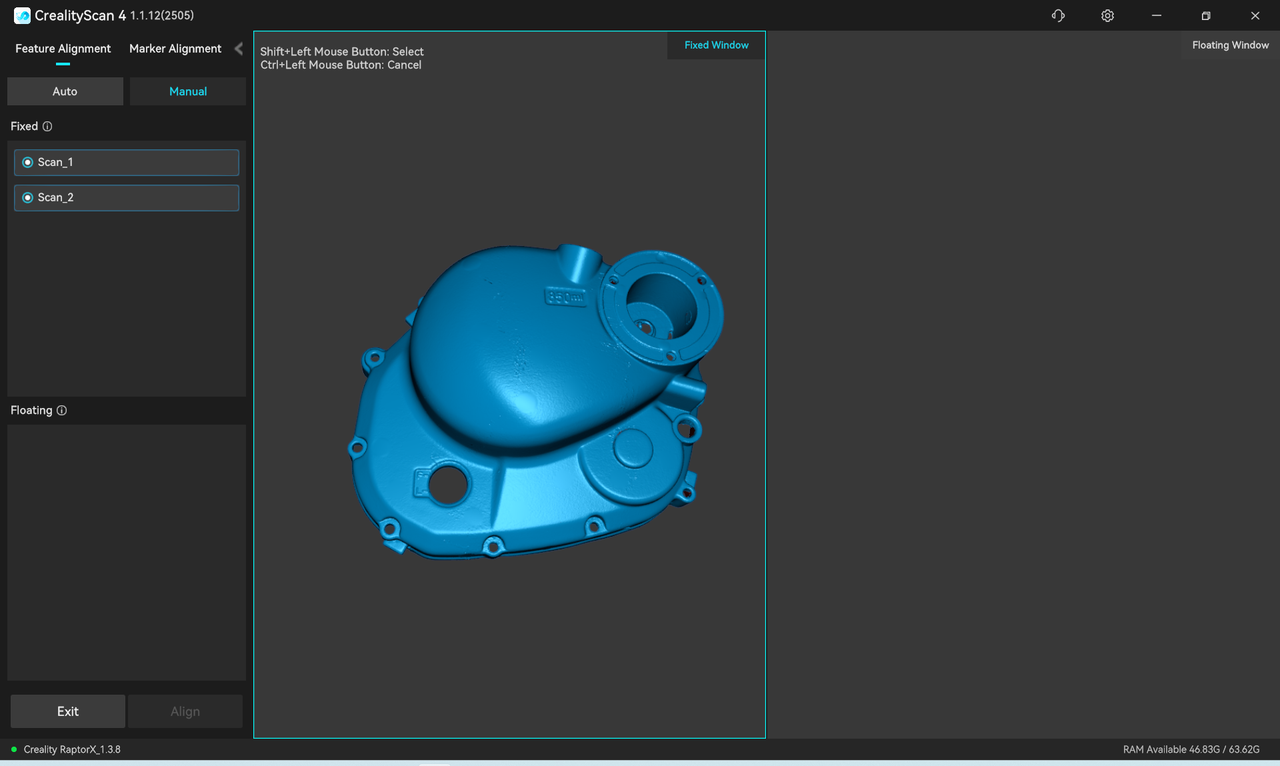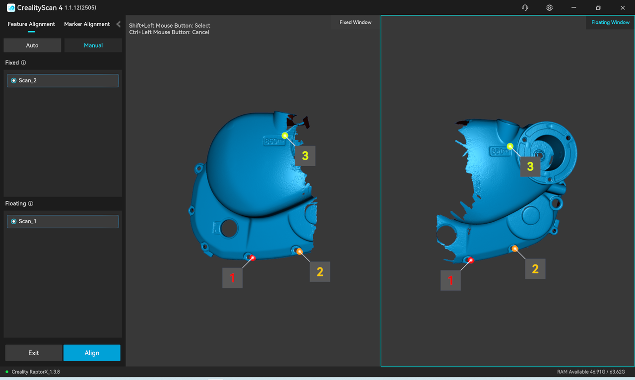 The left sidebar displays a list of fixed and floating windows. In the manual feature alignment mode, select a sub-project to be aligned from each of the two lists on the left and display it in the corresponding fixed and floating windows. Then, select at least three pairs of matching points on the models in the fixed and floating windows.。