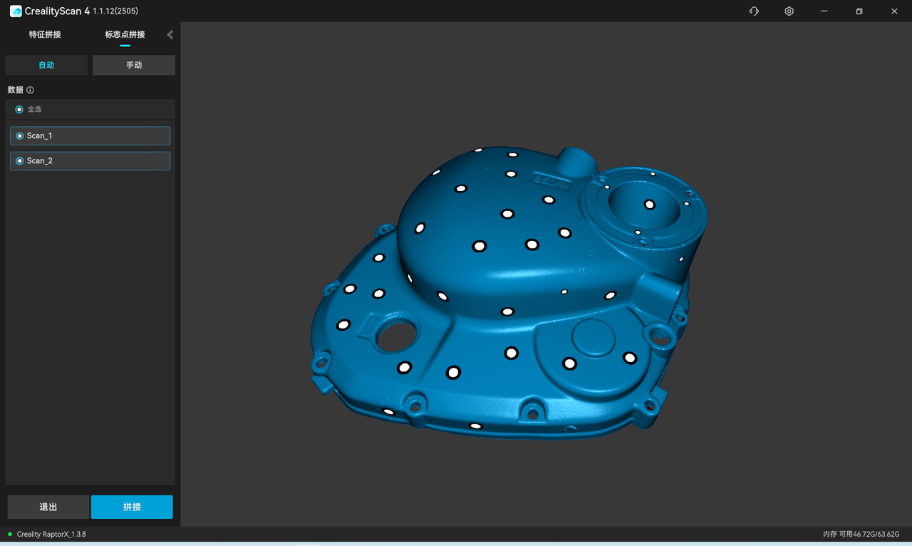 After scanning is completed, one-click processing or manual processing is supported. The manual processing sequence is Fusion-Mesh-Color Mapping. After point cloud fusion, you can choose to edit the point cloud or use it for aligning multiple point clouds.