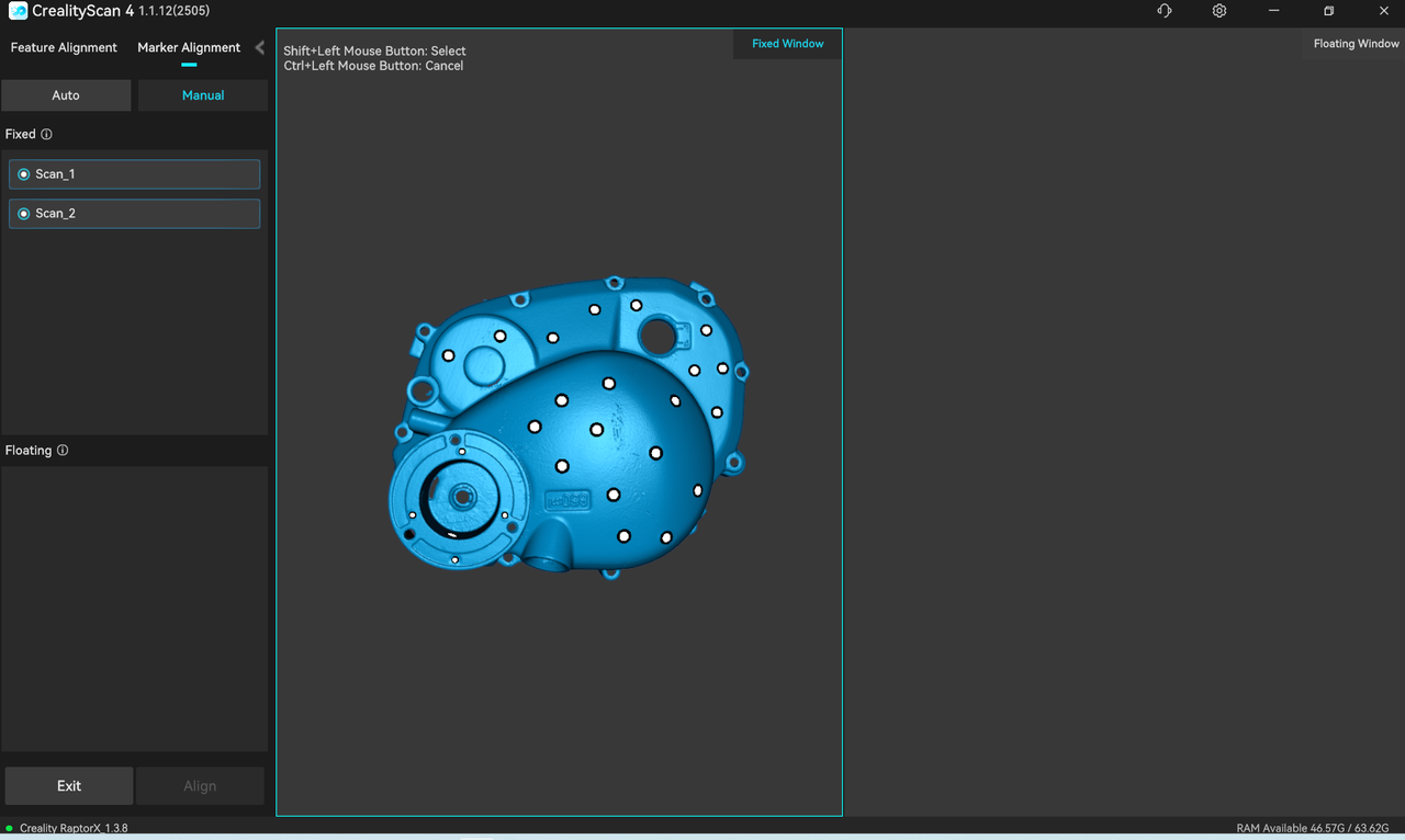 The left sidebar displays a list of fixed and floating windows. In the manual marker alignment mode, select a sub-project to be aligned from each of the two lists on the left and display it in the corresponding fixed and floating windows. Then, select at least three pairs of matching markers on the models in the fixed and floating windows.