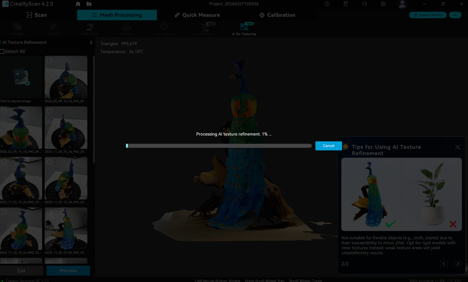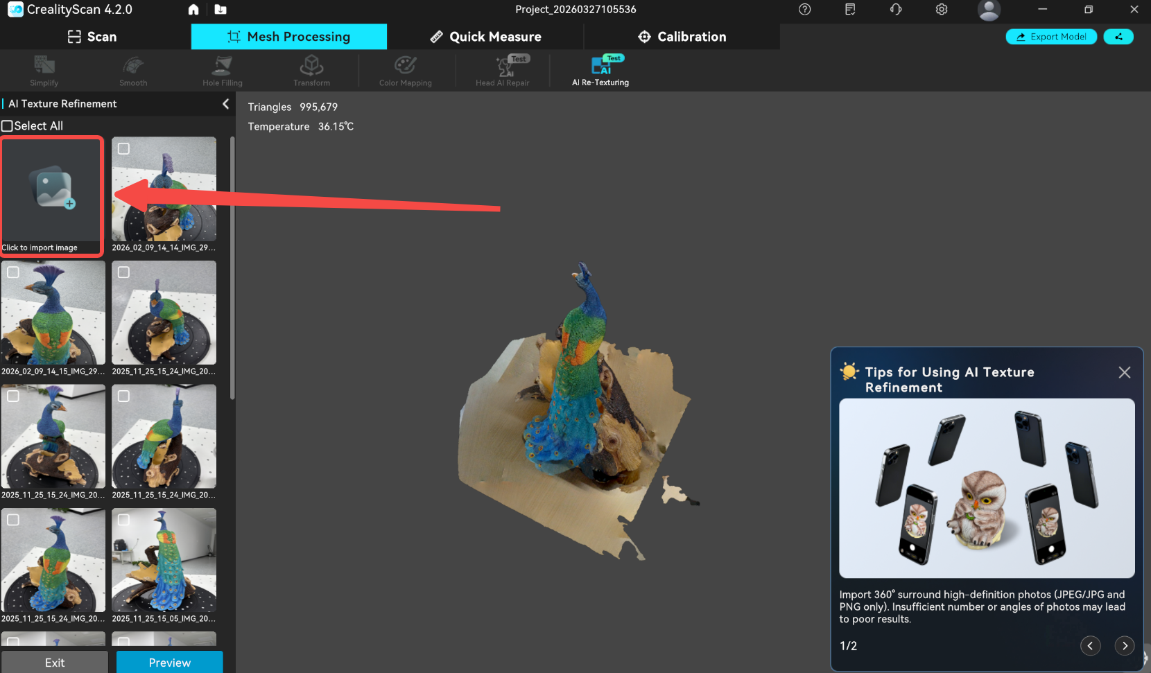 Perform 360° surround shots around the model that requires AI Re-Texturing. Insufficient number of images or range of angles may lead to poor results. Supported image formats: JPEG, JPG, PNG. Import the captured high-definition images into your computer.