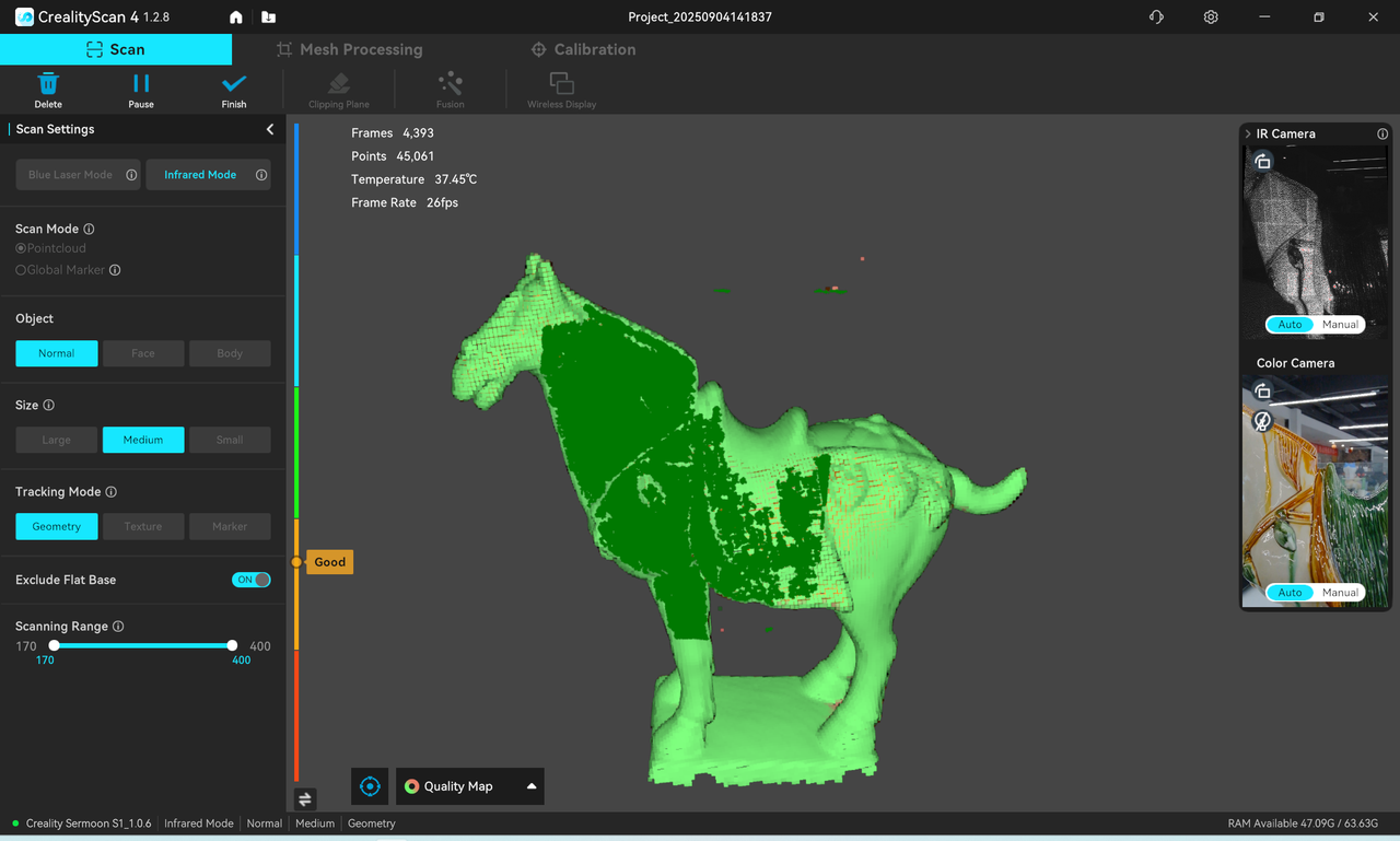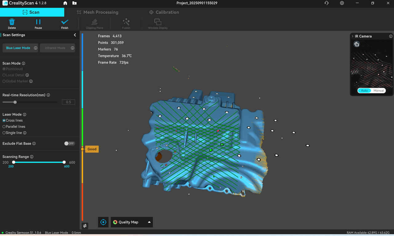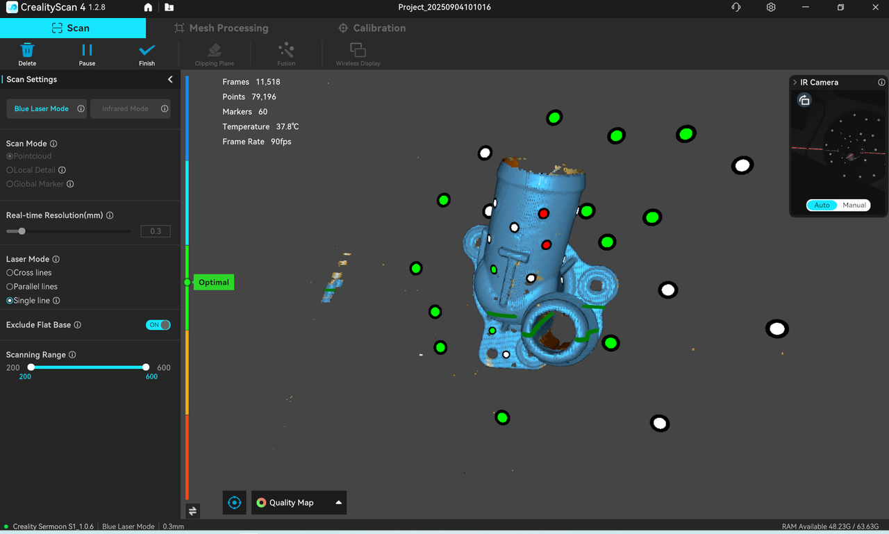 Turn on the "Quality Map" mode, continue scanning according to the interface prompts until all point clouds of the scanned object turn green, indicating that all model data has been acquired and the model quality is high.