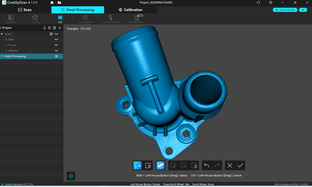 After scanning is completed, one-click processing or manual processing is supported. The manual processing sequence is Fusion-Mesh-Color Mapping. After point cloud fusion, you can choose to edit the point cloud or use it for aligning multiple point clouds.
