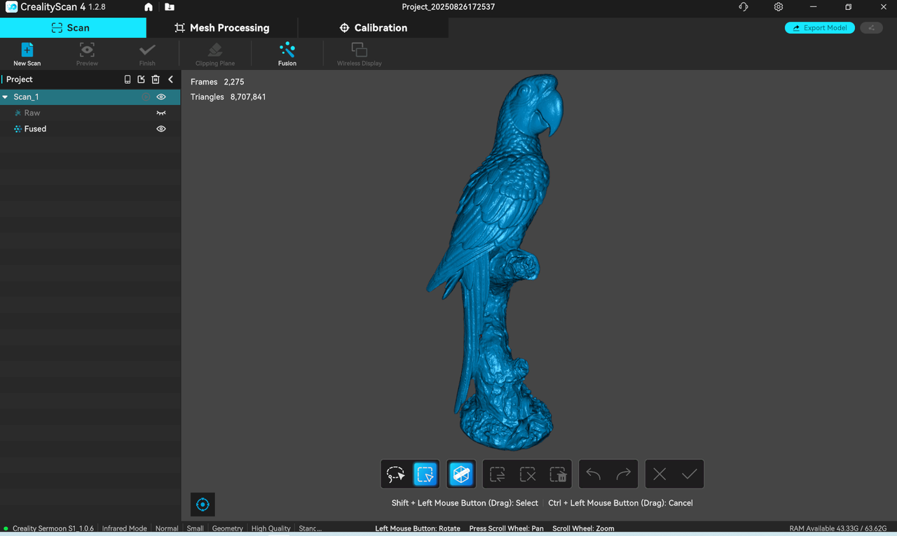 After the scan is completed, the, original point cloud and fused point cloud can be edited and processed. The editing toolbar is located on the right side of the main area. Similarly, the meshed model can also be edited and processed (click the "Edit" button in the upper toolbar to perform "Mesh Simplification", "Mesh Smoothing", or "Hole Filling" operations.)