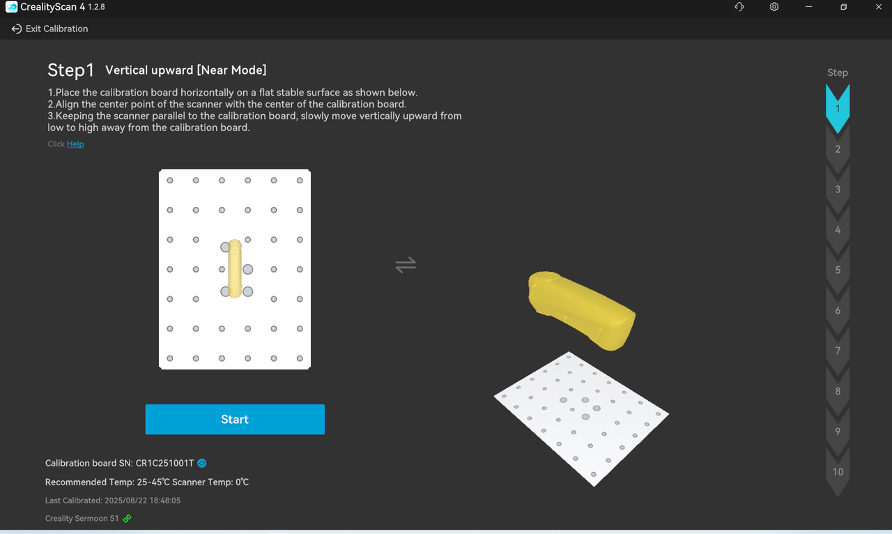 After entering the acquisition process, be sure to aim the scanner at the front of the calibration board and move the scanner according to the guidance.