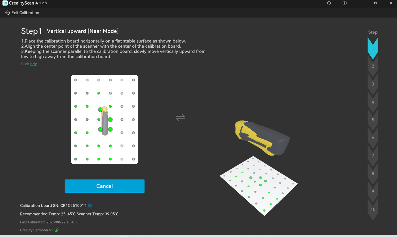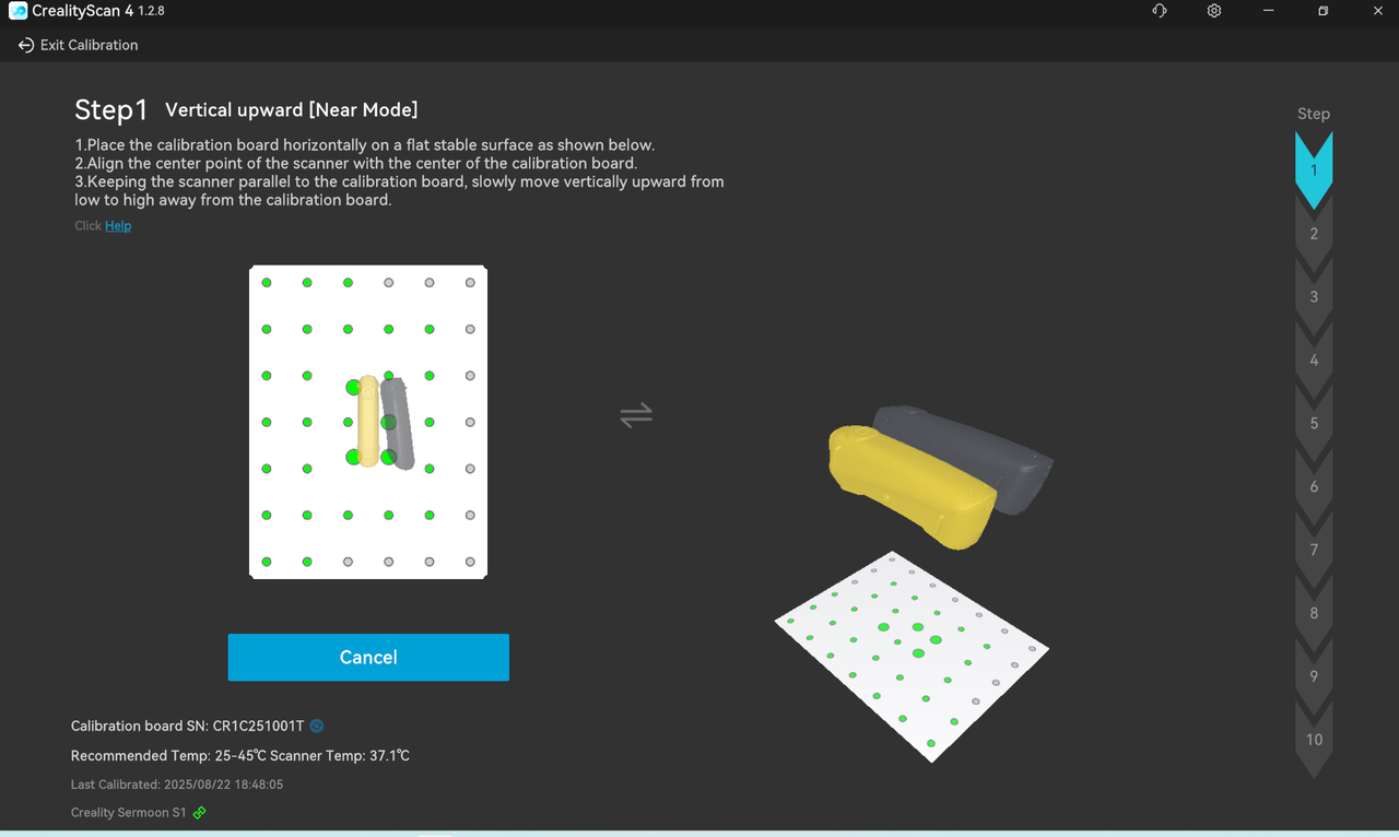 The bottom left shows the calibration board number and scanner temperature. Please make sure to perform calibration within the appropriate temperature range. The rightmost side shows the current step.