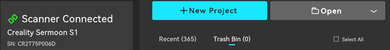 ③ Click "New Project" to start a new scan. Click "Open" and select "Open Project or Model" to import multi-projects (.obp format) or view models (.stl, .obj, .ply format) from a local folder. Click "Import from Smart Phone" to import projects from the mobile APP through the LAN, and be sure to keep the mobile phone and computer in the same LAN.