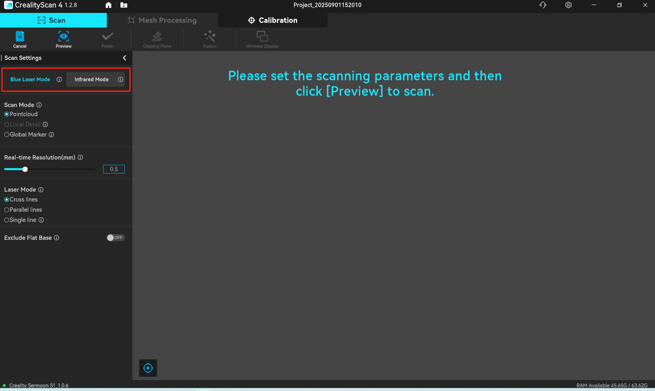 Set the scan configuration and click "Preview" to preview the image and point cloud. You can also adjust the exposure and laser brightness (if you're using blue laser mode).