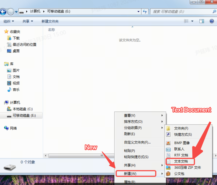 1. Open the USB drive root directory → right-click → New → Text Document