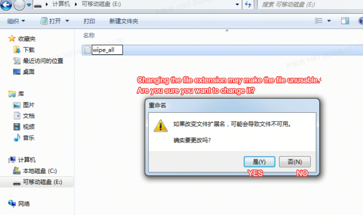 2. Rename the file to wipe_all, remove the extension (you need to disable the "Hide known file extensions" option).