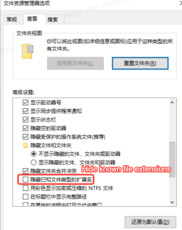 Demonstration: Press Win+R, type control folders → View → uncheck "Hide extensions"