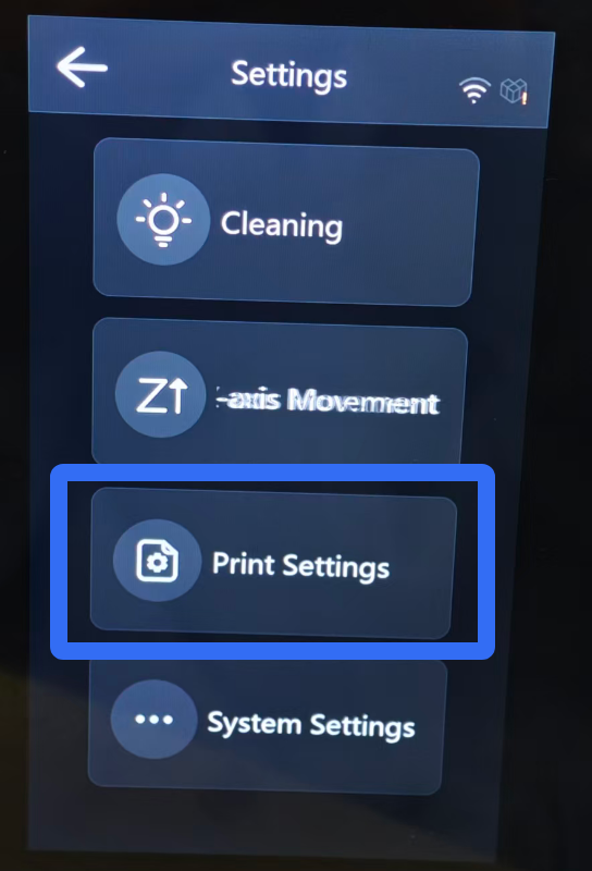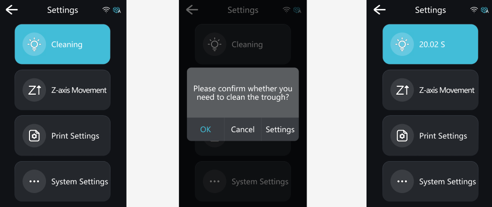Cleaning: Start full-screen exposure to solidify any remaining resin in the vatin, aim to clean impurities. This function can also be used to check whether the screen has any dead pixels. Enable Cleaning, the system will prompt you to select whether to clean the trough and configure settings.