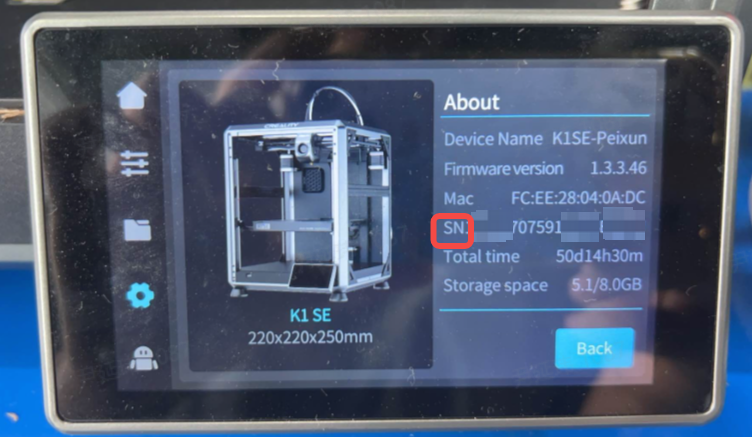 Click "Settings" - "System" - "About" on screen to view the SN code (using K1 SE as example)