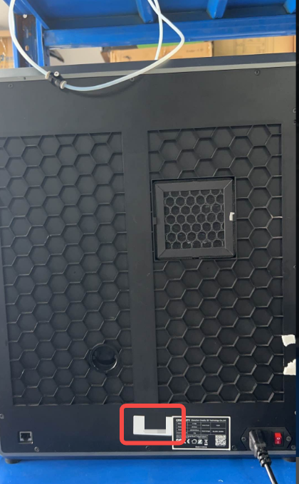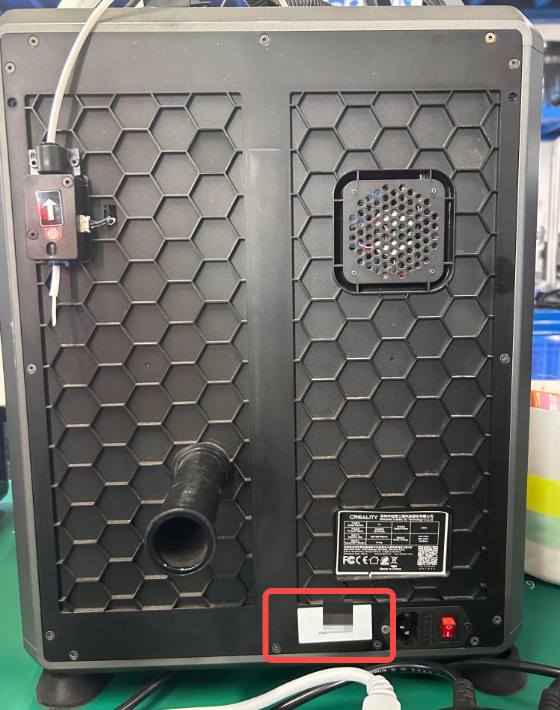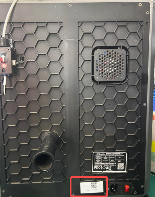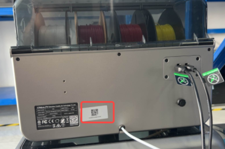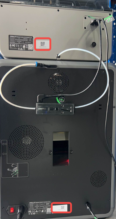 K2 series Combo models consist of a single machine and CFS. The single macine's SN code is on the right side of the power switch on the back, while the CFS;s SN code is on the left side of the PTFE tube on the back. Both appear as white QR code stickers, with the SN code being the number & letter combination at the bottom.