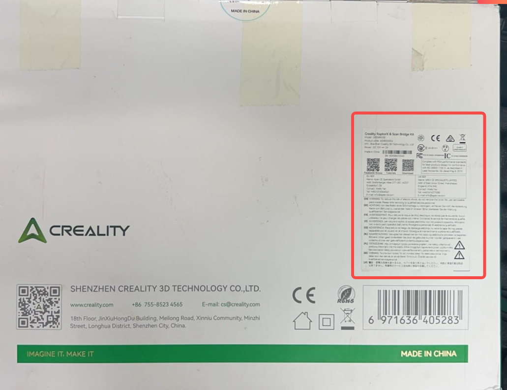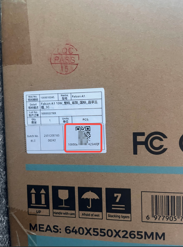 Check the QR code in the marked area on the side of the outer packaging box (e.g. Falcon A1)