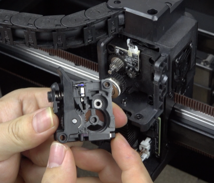 Place the extruder gear, squeeze the extruder clamp, install the extruder front cover.