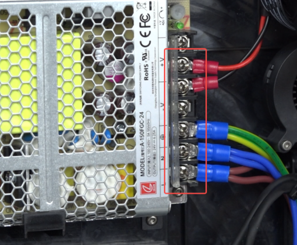 Insert power cables as shown in the diagram, tighten terminal screws with Phillips screwdriver.