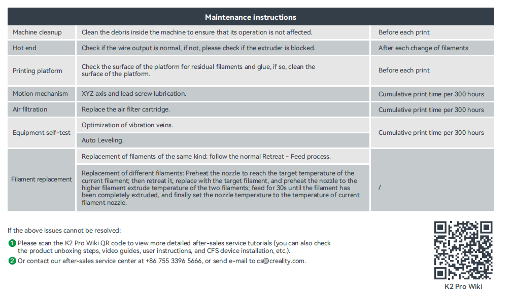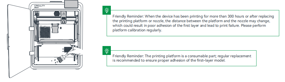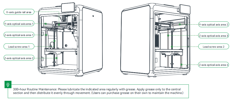 9. Clean the printer frequently. Clean the printer body with a dry cloth regularly after powering off the printer, wipe away dust, bonded print filament and foreign objects on the guide rails;