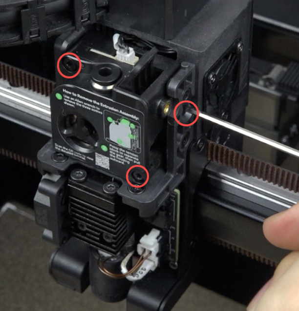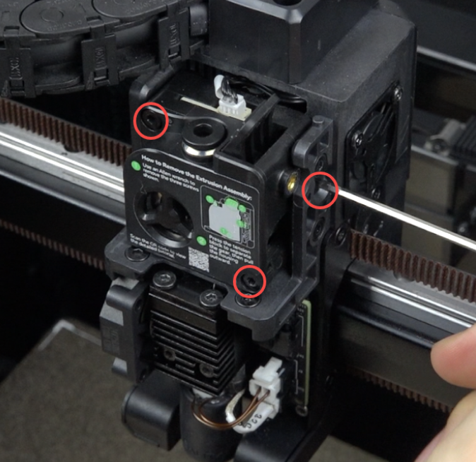 Use the hexagonal wrench to remove the 3 screws securing the extruder front cover.