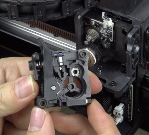 Place the extruder gear, squeeze the extruder clamp, and install the extruder front cover.