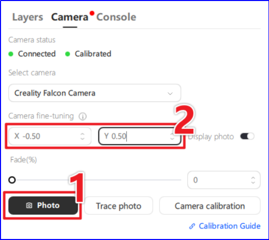The software will automatically connect the device to the Creality Falcon Camera for camera calibration interface.