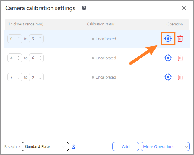 ②. It is recommended to add a range calibration once for the thickness of 1-3mm. The system can automatically adapt the camera calibration parameters corresponding to the selected thickness in the material library. When the selected material thickness is not within the range or non-standard, the system will apply the first thickness range calibration parameter by default;
