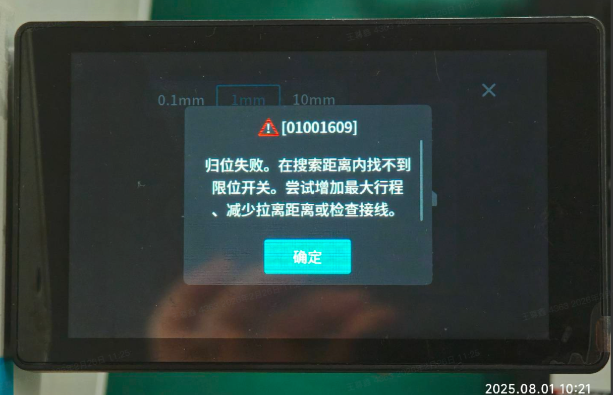 ¶ 01001609: Home return failed. Limit switch not found within the search distance. Try increasing the maximum travel, reducing the pull-off distance, or checking the wiring.