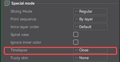 In the Creality Print menu bar, navigate to Other → Special Mode → Timelapse.