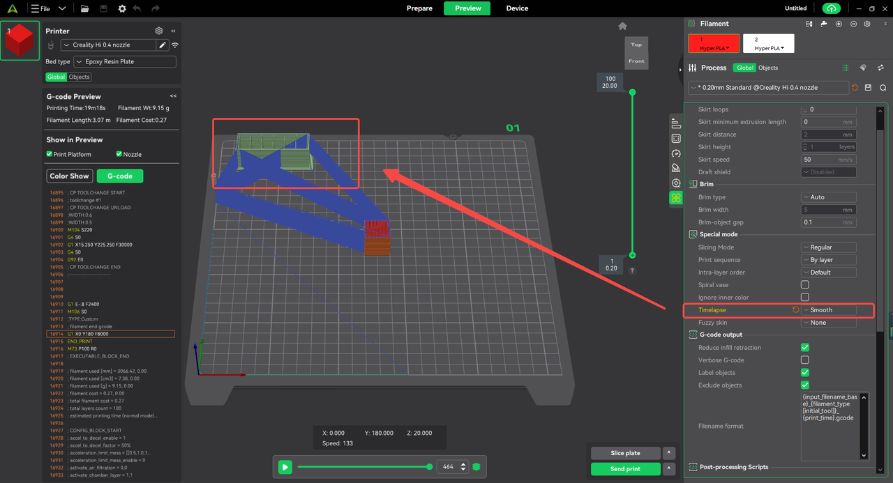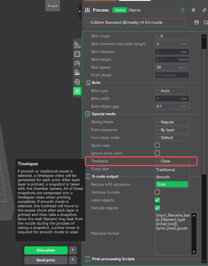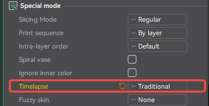 There are three time-lapse modes available: Off, Smooth Mode, and Traditional Mode. This feature has been optimized specifically for the Creality Hi printer, as detailed below.