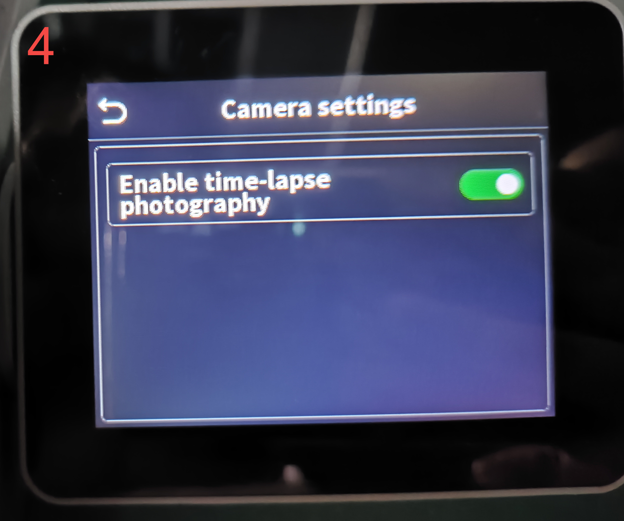 On the printer touchscreen, navigate to: Settings → System → Camera → Camera Settings, and check if Time-lapse is enabled. (This setting is enabled by default.)