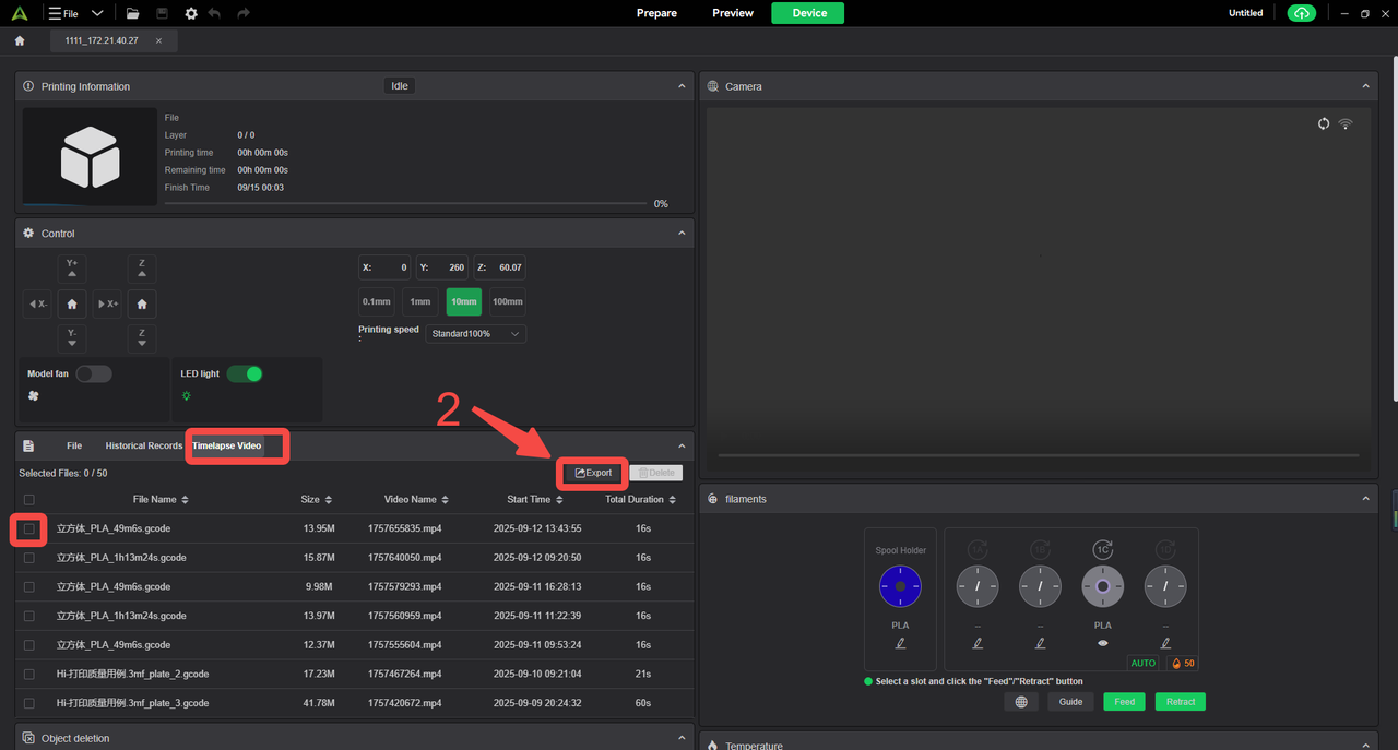 Navigate to Printer Device → Details → Time-lapse video, select the file, and export it. Wait for the export to finish.