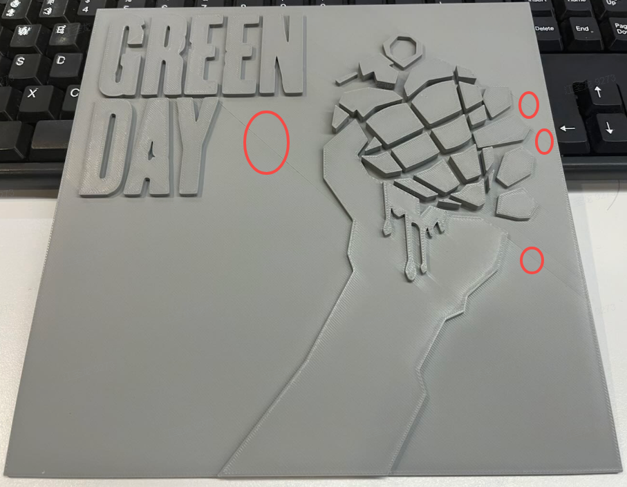 In scenarios such as printing embossed reliefs, it is common for the top surface path to be too complex to complete in a single continuous pass. When the path pauses in one area and then returns to print, the already printed lines have fully cooled and shrunk. This reduces adhesion between the previously extruded filament and the newly extruded filament, resulting in visible gaps on the surface.