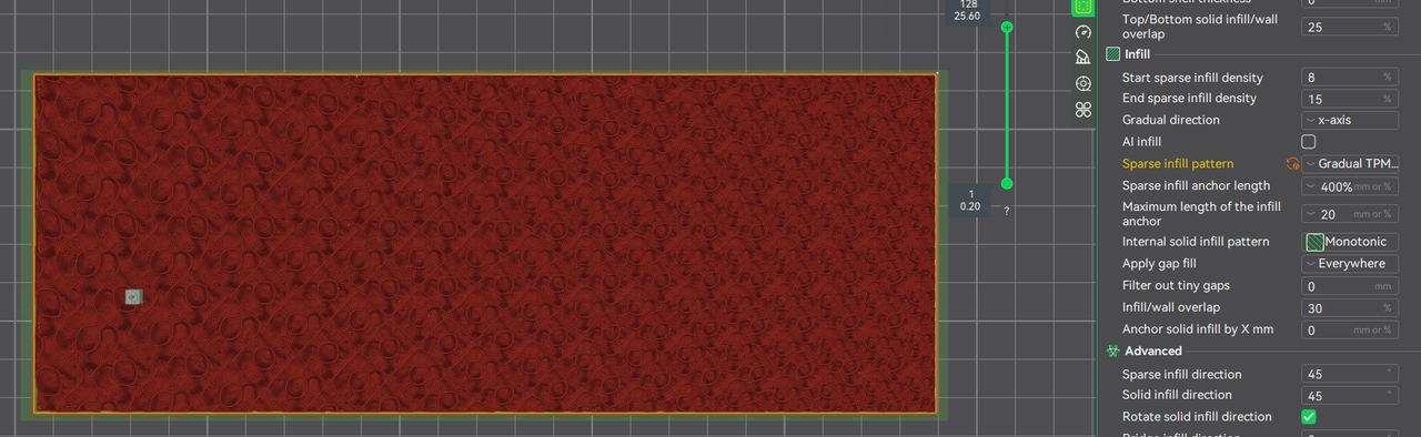 Currently, most FDM printing infill methods use a uniform density. In certain cases where adjusting the center of gravity is necessary to improve the stability of the printed model — for example, objects that are top-heavy (such as large-headed figurines) — using uniform infill density can waste material and result in instability. For objects that are large at one end and small at the other, it is desirable to increase infill density in the smaller sections to enhance local structural strength, while maintaining higher density in the larger head section.