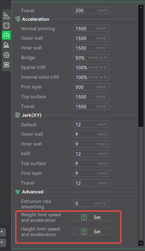 In this update, parameters such as speed, acceleration, and jerk limits are displayed as non-editable fields in the printer settings interface. The system now dynamically clamps these values based on the device’s hardware capabilities to prevent lost steps, ringing artifacts, and excessive mechanical wear.