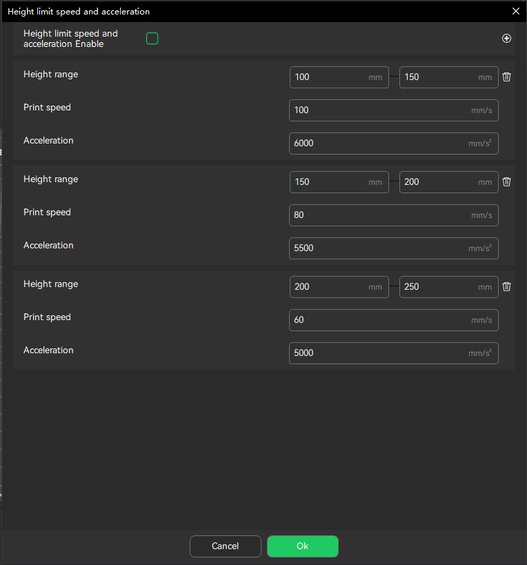 The taller a model is, the higher its center of gravity becomes, making vibrations more likely to be amplified. With the new Height(Weight) limit speed and acceleration, you can set specific thresholds near the top or within designated height ranges. When these thresholds are reached, the printer automatically reduces speed and acceleration to the configured values, helping to minimize vibration and oscillation. This improves the print quality of tall towers or slender structures, enhances the stability of high models, and increases overall print success rates.