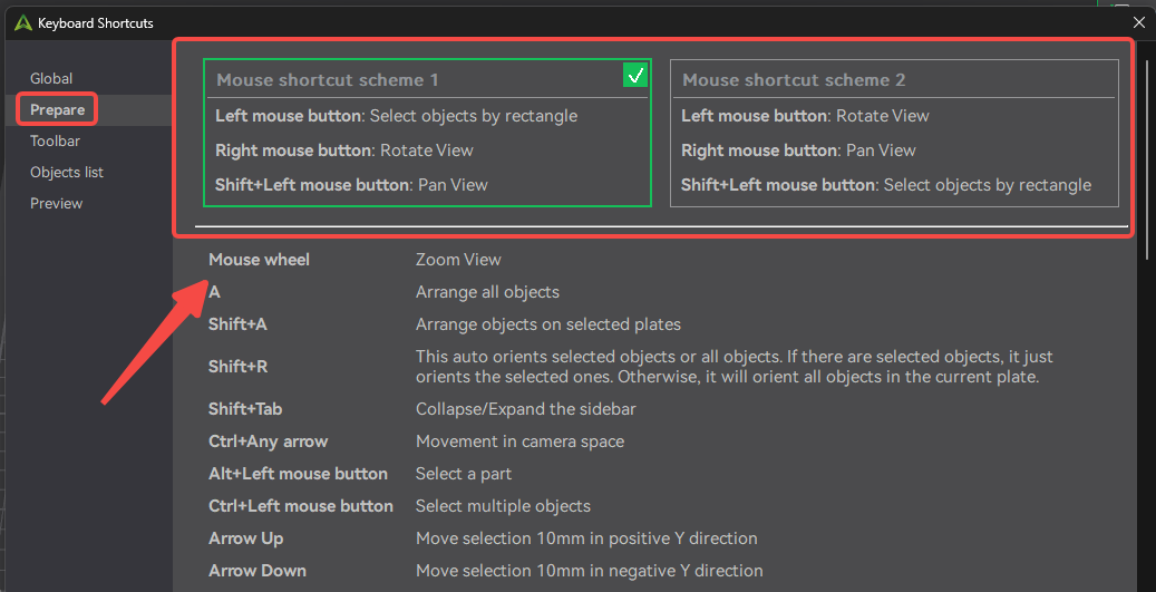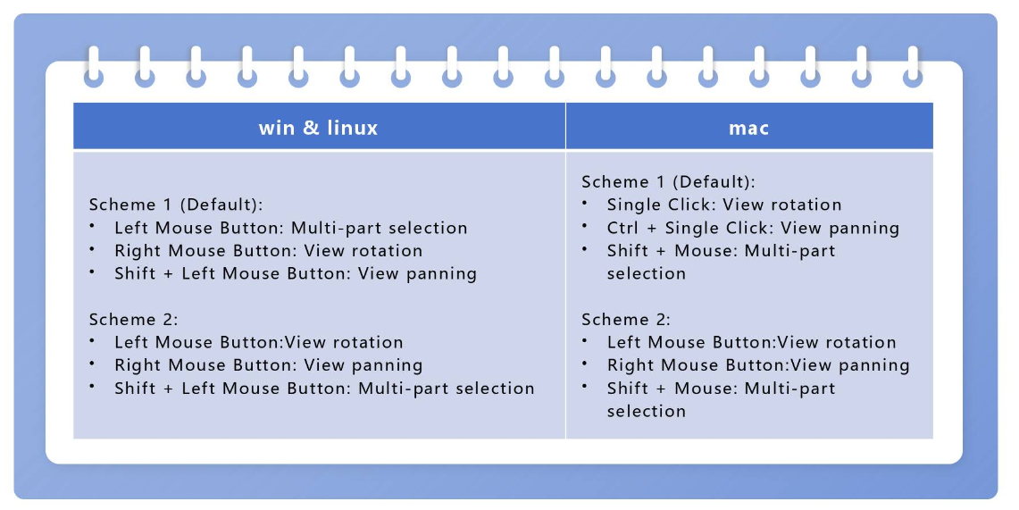 Dual hotkey schemes have been added for three frequent operations: Select objects by rectangle, Rotate view, and Pan view. Users can switch between scheme 1 (default) and scheme 2 at any time. Thanks to @Roberto and @Joerandazzo85 for the suggestions.
