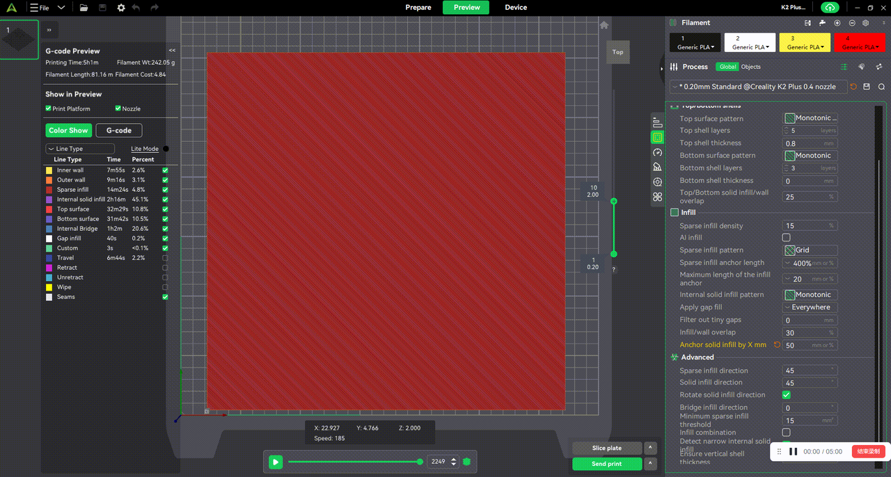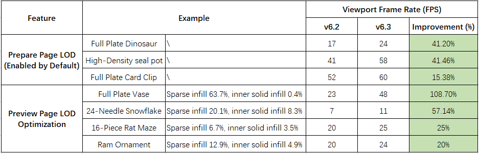 Enhanced LOD optimization for the preview view, particularly when “Simplified Mode” is turned off. Frame rates improve by about 20%–100%, with noticeable smoothness improvements in scenarios involving large infill structures.