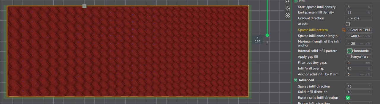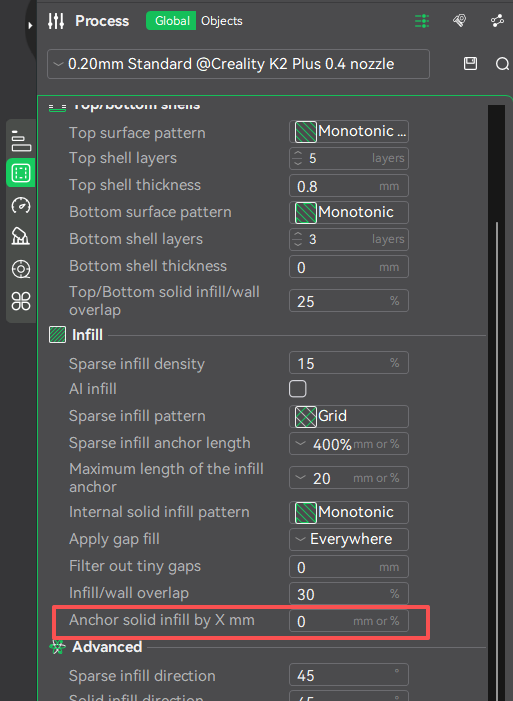 Optimization Solution: A new feature — Anchor solid infill by X mm (thanks to contributions from @SuperSlicer) has been added. By default, this feature is disabled (parameter set to 0). Users can enable it and set the parameter value according to the model’s characteristics.