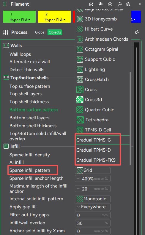 Driven by this scenario, three new TPMS infill types have been developed to enable gradient infill, allowing infill density to vary along the printing direction to improve stability and material efficiency.