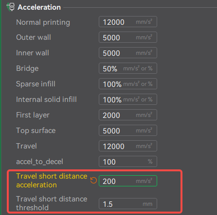 New Process Parameter: Speed → Travel short distance acceleration; Travel short distance threshold