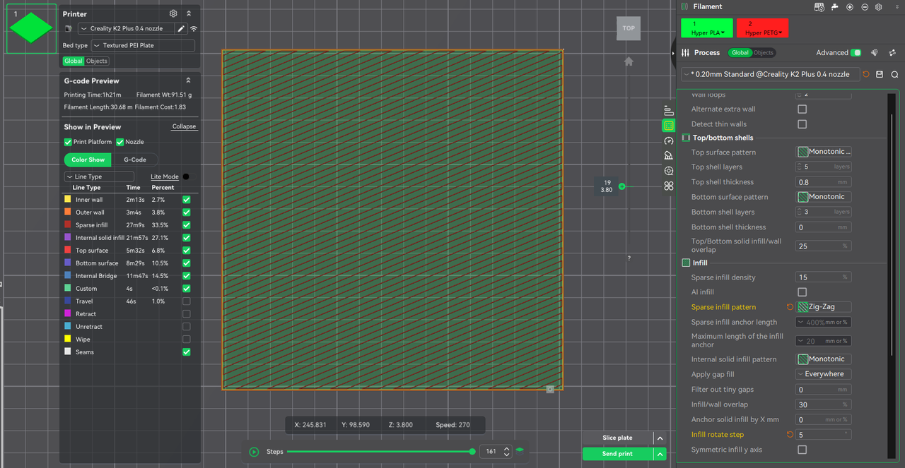 Improve surface quality:Continuous, surface-friendly infill (such as Zig Zag or Concentric) can be applied to shell contact areas to reduce the impact of internal infill on the surface, resulting in smoother and more stable top surfaces.