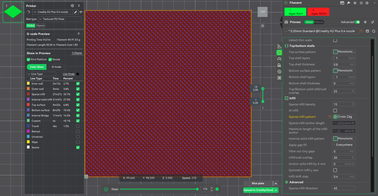 C. Cross Zag:Similar to standard Line infill, its infill translation step can be adjusted to offset the next layer’s infill by a certain line width through translation.