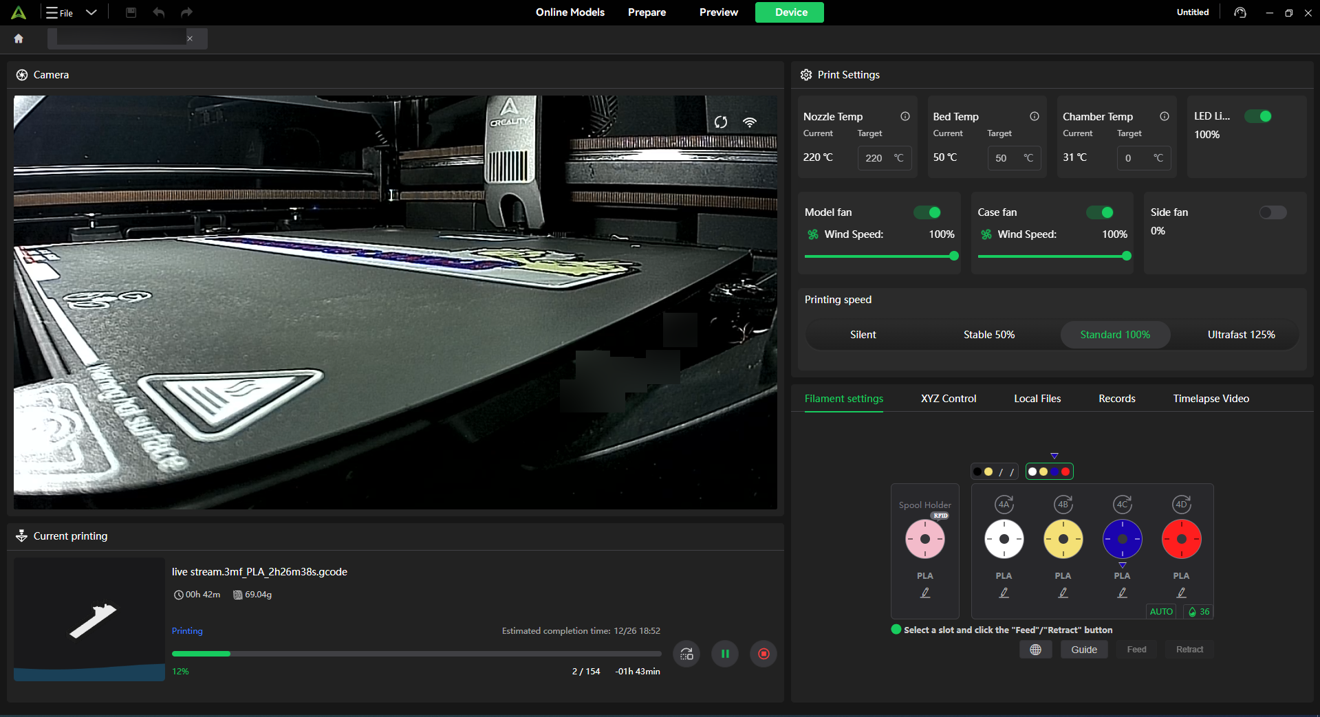 The camera preview feature for devices bound to Creality Cloud is now available. Once printing begins, you can view real-time previews. Currently, playback automatically pauses after 15 seconds, but you can resume manually with a click. Effortlessly manage the entire remote printing process.