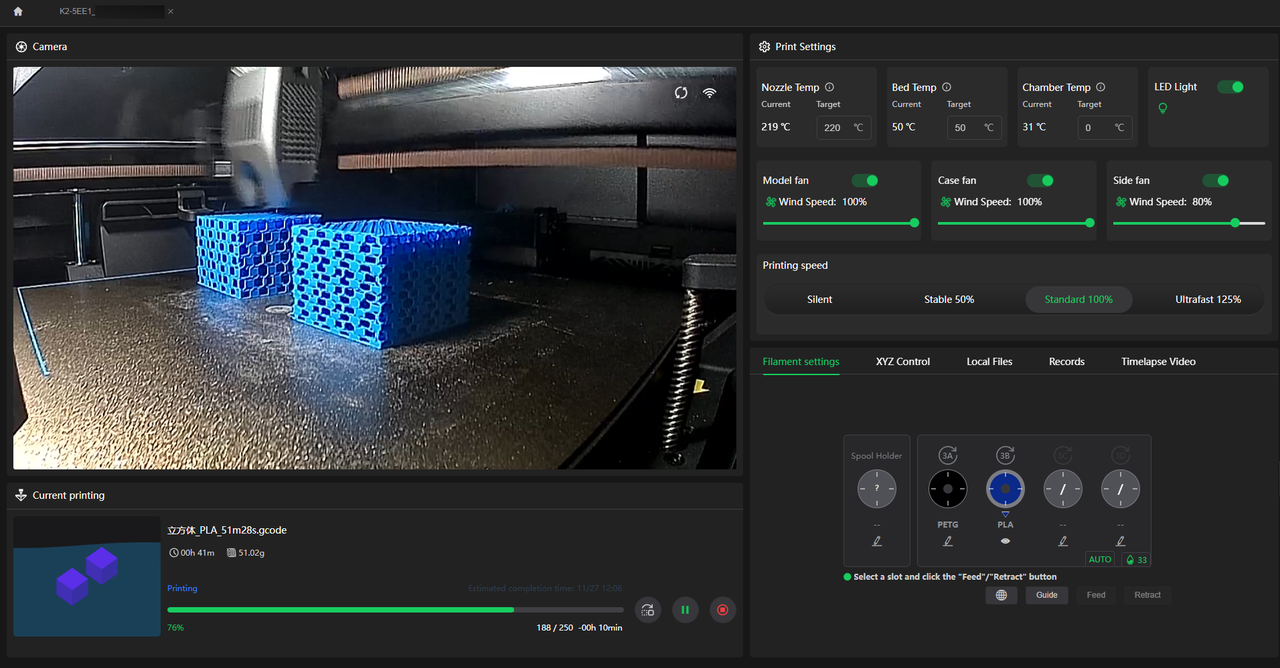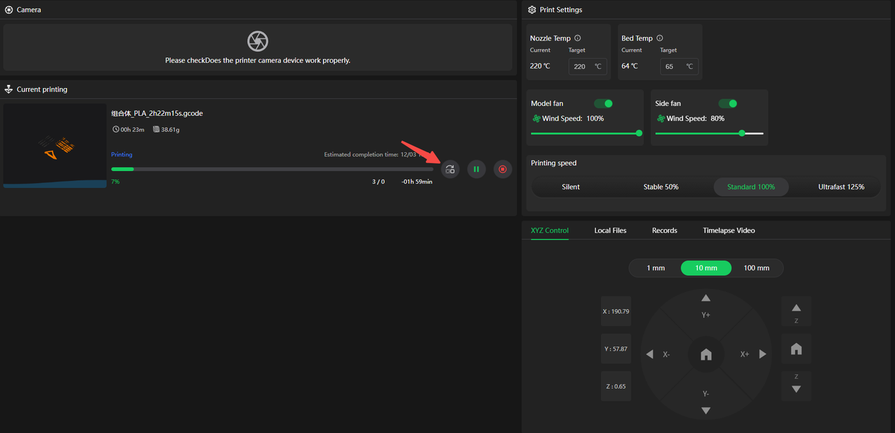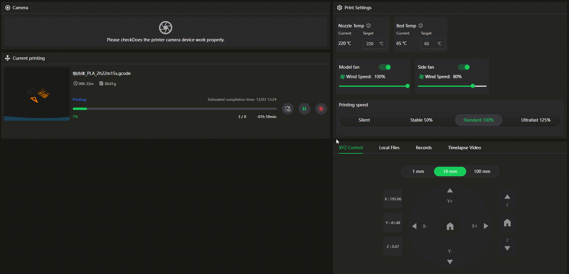The functional areas are now further clarified: the left side focuses on the camera and the real-time printing display area, while the right side sequentially integrates printing settings, filament settings, XYZ control, local files management, print history, and timelapse video according to operational logic, effectively improving operational convenience and visual clarity.