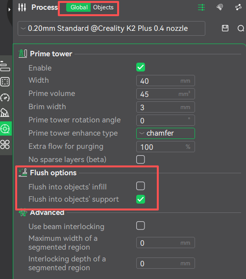 Example: Changing from black to white requires flushing 100 mm of filament. If the next layer’s supports require 40 mm, enabling this feature will flush only 60 mm before proceeding to print the wipe tower and then the supports. This may cause slight color mixing in the supports but will not affect the main model’s print quality.